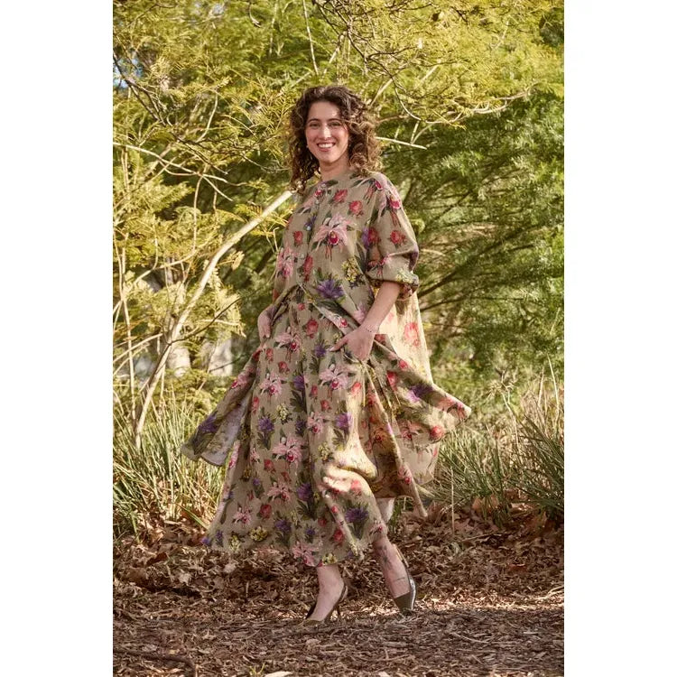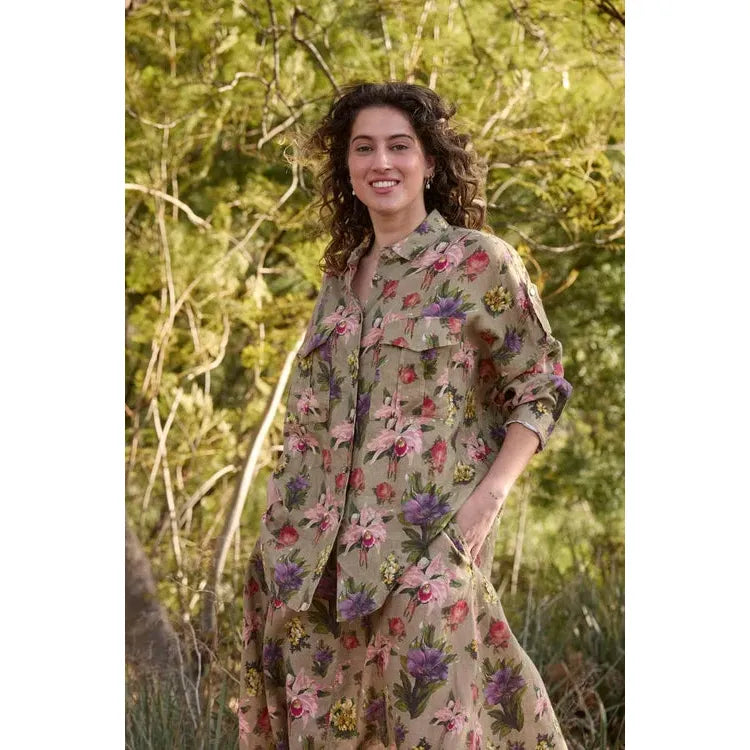 The Circular by M.A.Dainty Aster Skirt in Botanist print offers a high-waisted, flowy silhouette that blends elegance with ease. Its midi-maxi length enhances movement, while belt loops provide styling versatility. Practicality meets design with two front patch pockets and two side in-seam pockets. Finished with subtle Maud text on the back, this skirt pairs seamlessly with the Holly Shirt, creating a coordinated and sophisticated spring ensemble.