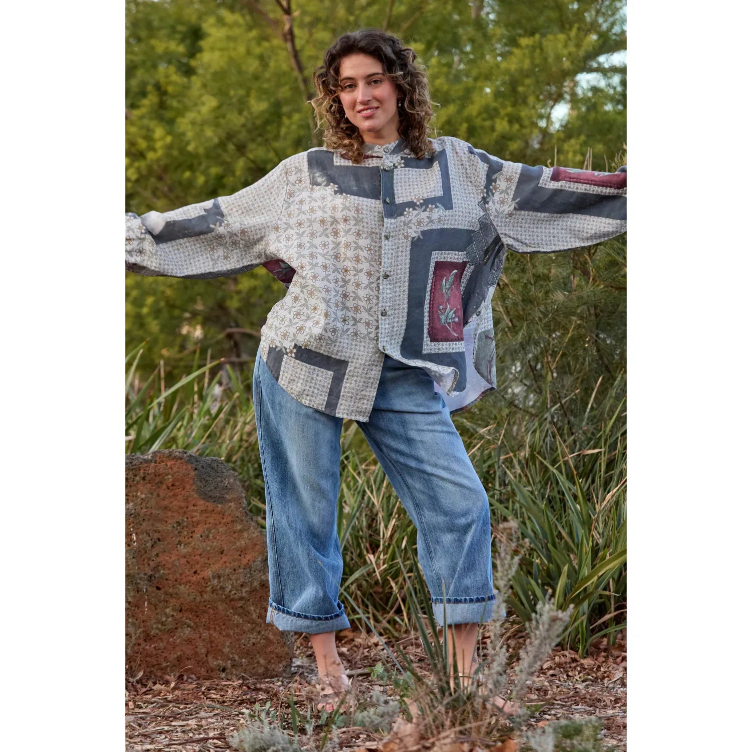 The Potter Shirt by Maud Dainty offers an expert blend of comfort and style with its oversized, relaxed silhouette and breathable lightweight fabric. Its patchwork-inspired print in soft earthy tones ensures versatility, while the full button-down front and cuffed long sleeves add classic detailing. The curved hem provides a refined finish, making this shirt perfect for layering or wearing alone, easily transitioning from casual denim to sophisticated tailored looks.