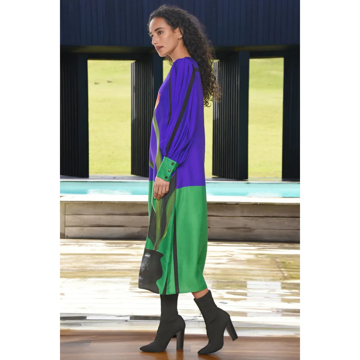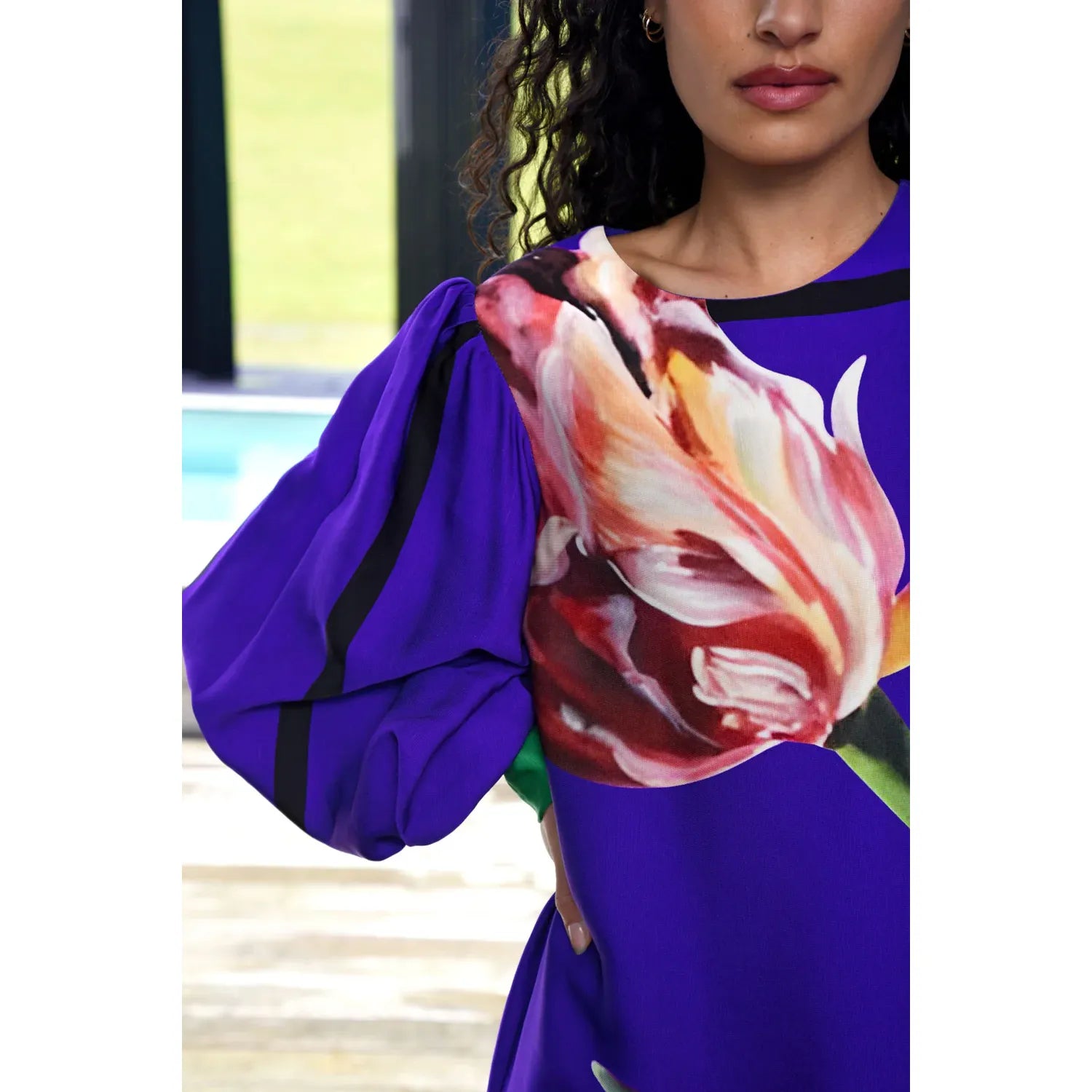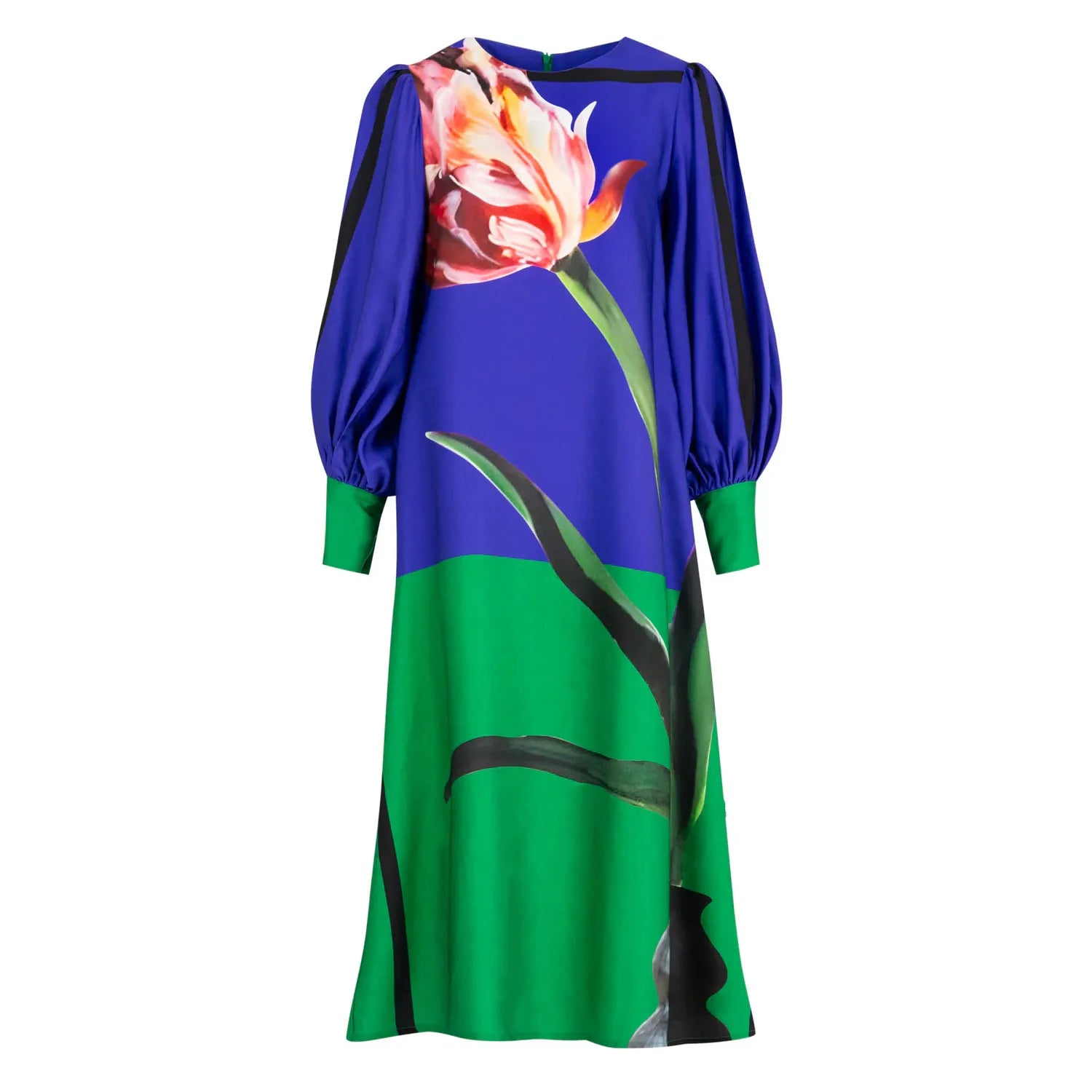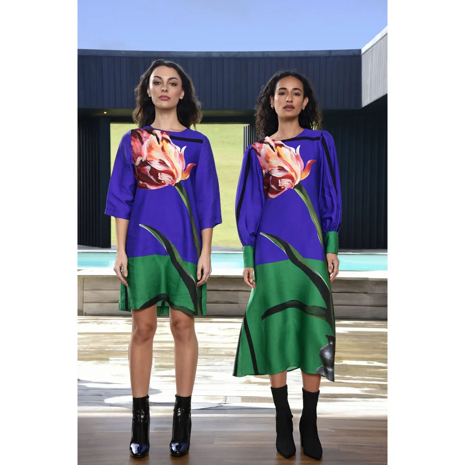 Romance meets rebellion in the ‘Sweet Simplicity’ dress that makes a statement from day to night. Featuring a bold tulip motif front and center, it blends soft femininity with an unmistakable modern edge. The full-length silhouette flows effortlessly, while the balloon sleeves and deep cuffs add a touch of structure and drama. Designed to transition seamlessly, pair with boots and a leather jacket, or with heels and minimal accessories. Crafted in the ‘Tulip Fever’ fabrication.