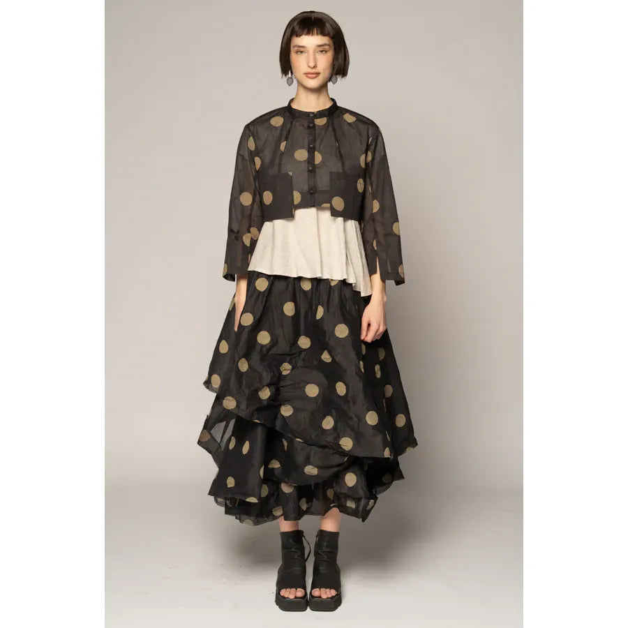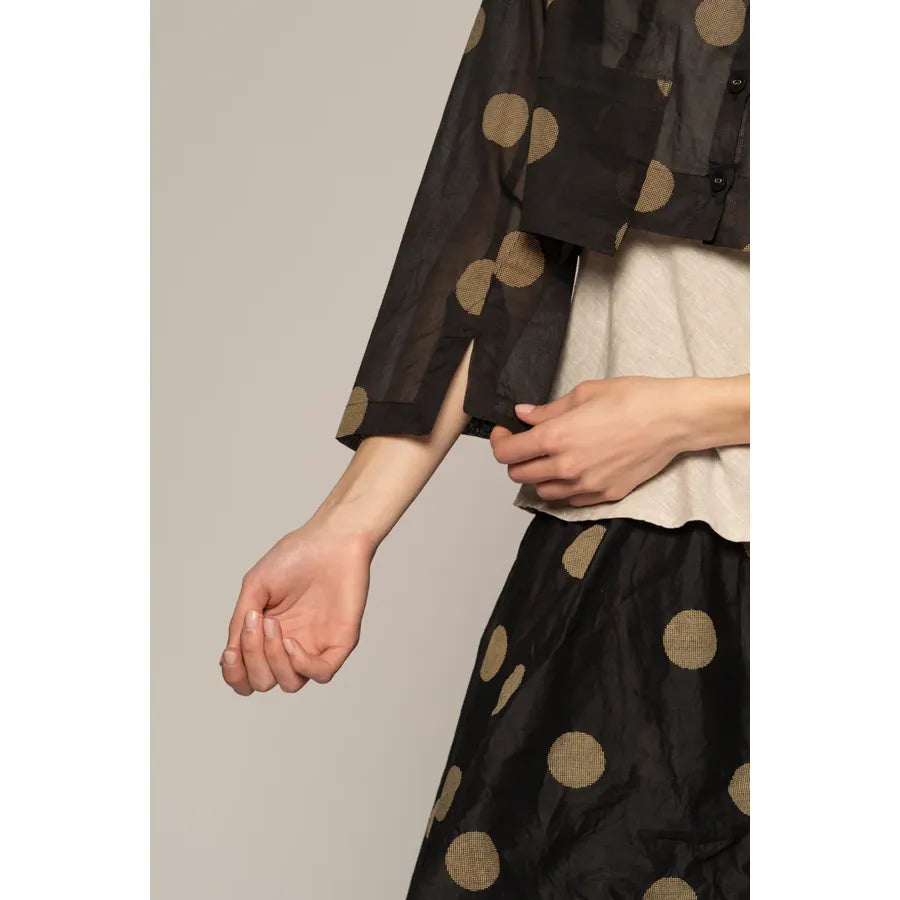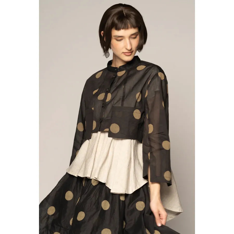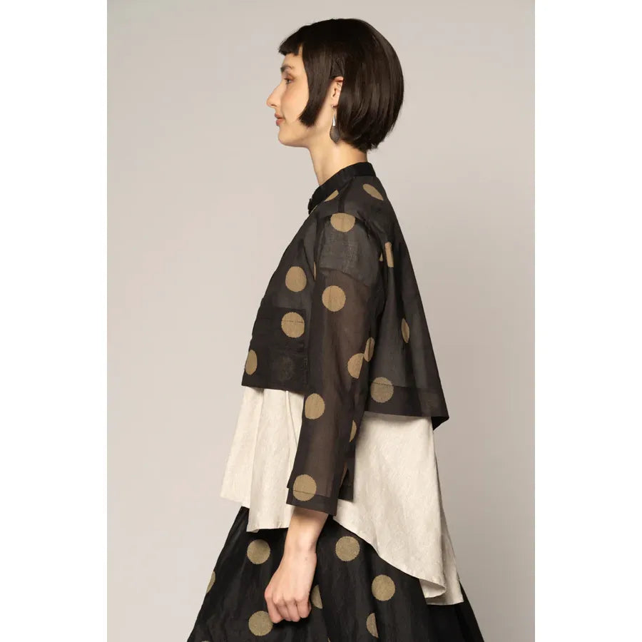 The Dotto Short Jacket feels airy and poetic—an easy layer that seems to float. Cut from whisper-light cotton organdy with a softly dappled dot motif, its cropped proportion brings gentle balance to dresses and wide pants alike. A neat mandarin collar and delicate buttons frame the face, while a subtle back split moves with grace. Front “hanging” pockets lend an artisan touch. Wear it buttoned as a delicate blouse or open as a jacket.