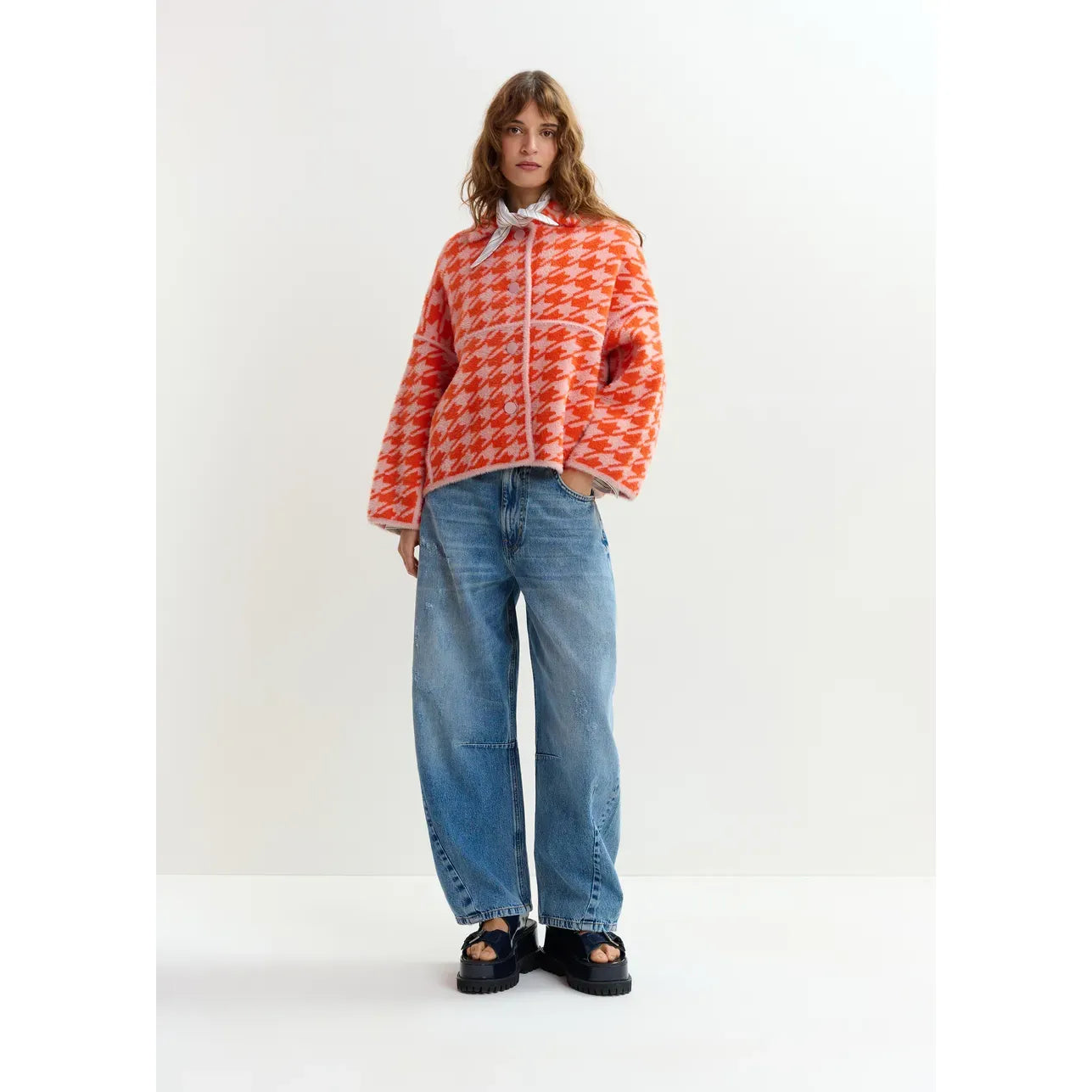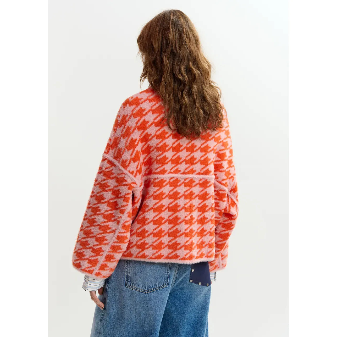Spun from a midweight knit with a soft, tactile finish, this jacket is shaped for an easy, relaxed fit that drapes effortlessly. The bold houndstooth pattern brings a playful graphic edge, while the clean button front and structured collar balance the silhouette with a refined touch. Finished with gently curved lines and subtle panel detailing, it offers comfort and character in equal measure.