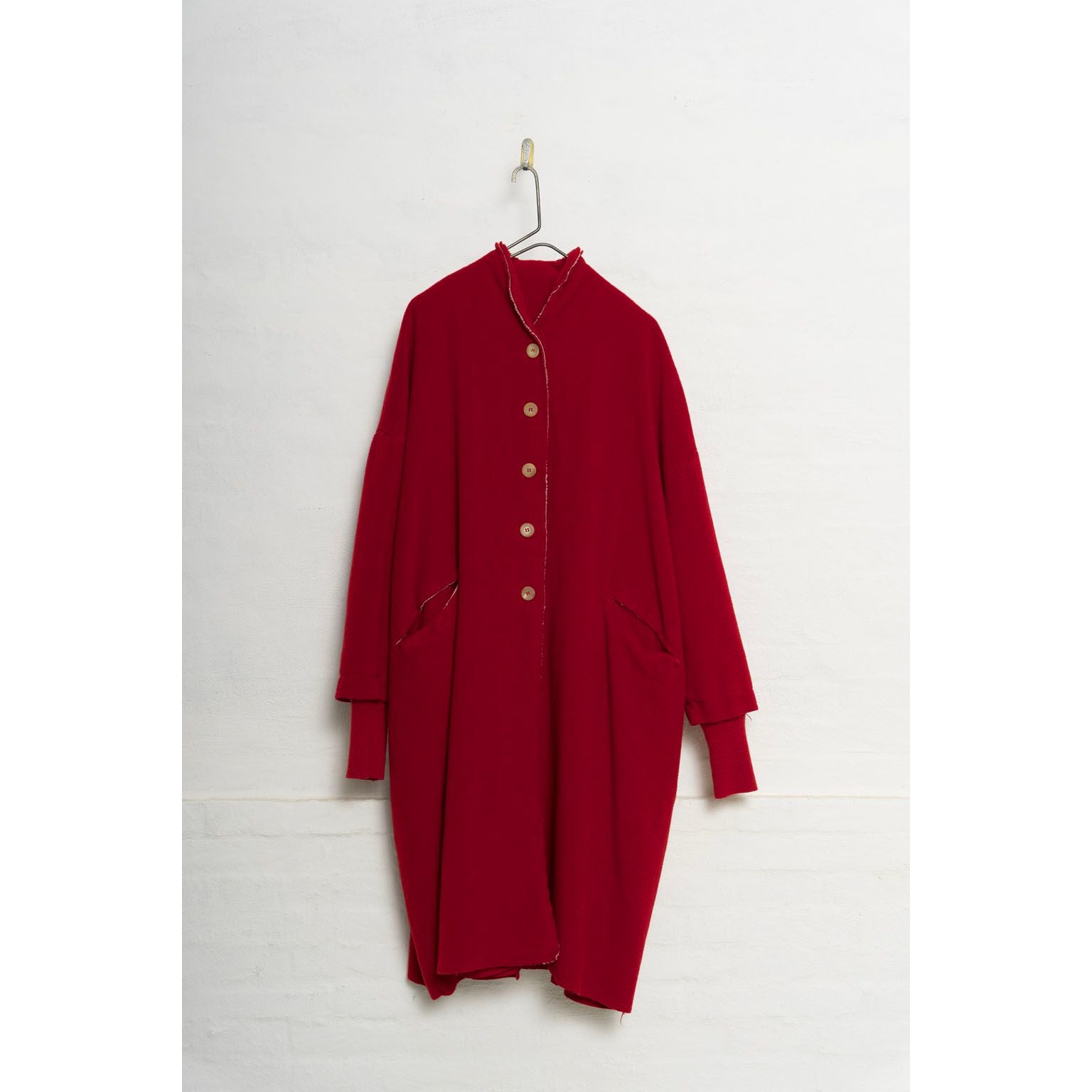 Wool and cashmere blend coat. Features dropped shoulders, front pockets and cashmere knit cuffs. Relaxed fit. Fully lined in Cotton