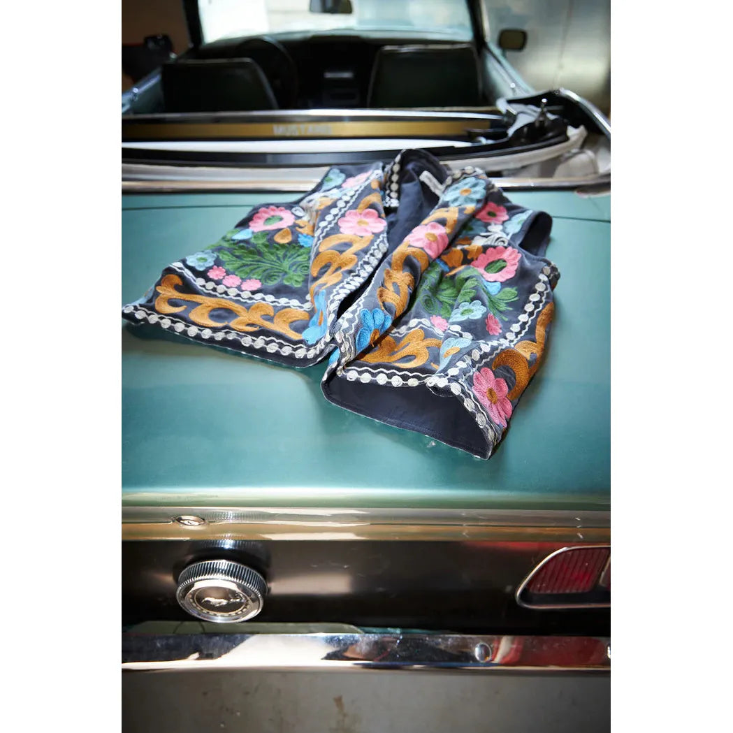 Embrace a bohemian-inspired style with the Bin vest, a true statement piece that adds color and character to any outfit. Made from luxurious, soft velour, this vest is adorned with beautiful floral embroidery in vibrant shades of pink, blue, and green on a classic grey or deep pink background. The bold pattern gives the vest a vintage look with a modern twist, perfect for styling over a simple T-shirt or your favorite dress. The Bin vest is not just a piece of clothing; it's a wearable piece of art.