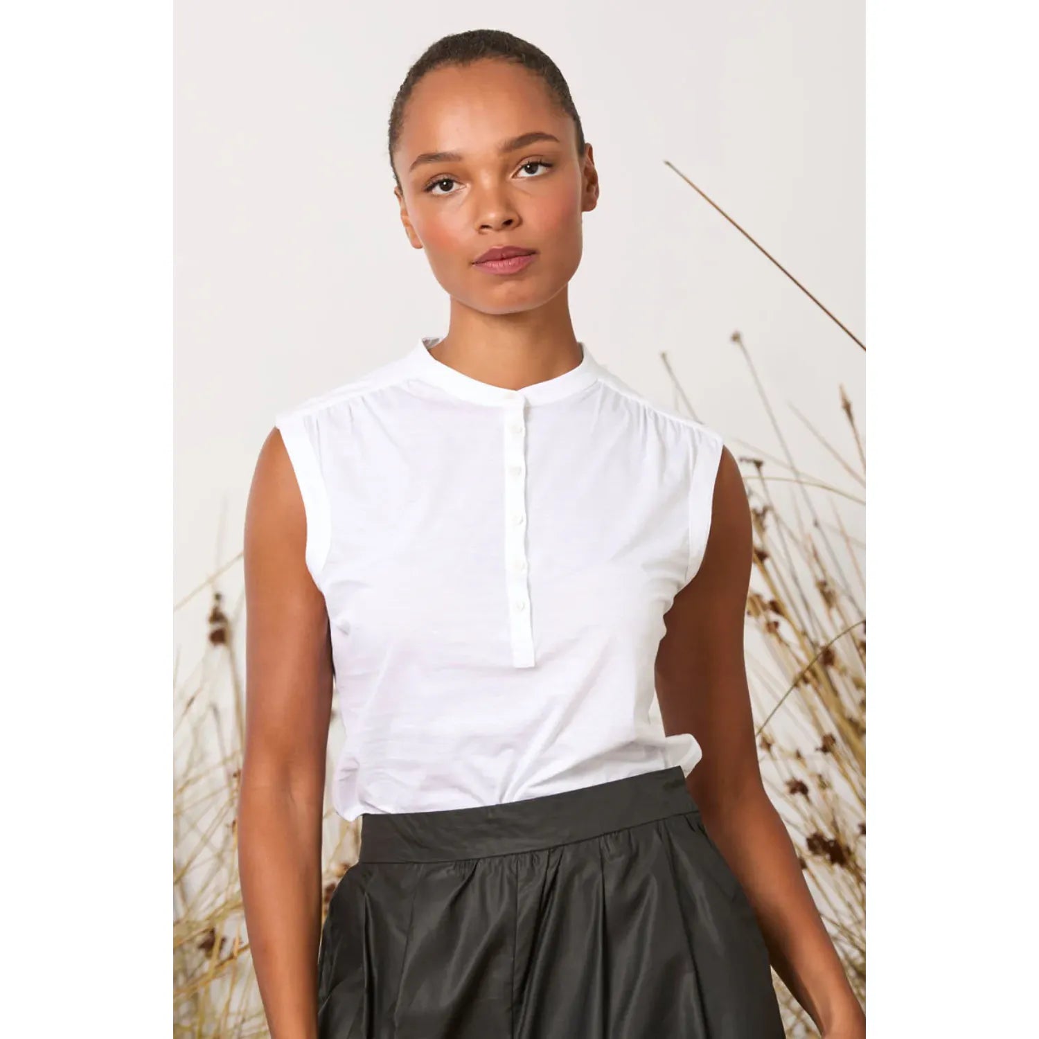 The M.A Dainty Stingray Top is a wardrobe staple designed for effortless style. Made from breathable cotton, its collarless, sleeveless design offers a clean, structured look with a relaxed fit. Featuring a Henley-style button-down front, this top ensures comfort and versatility, making it ideal for layering or standalone wear during spring. The Stingray top is also available in Black