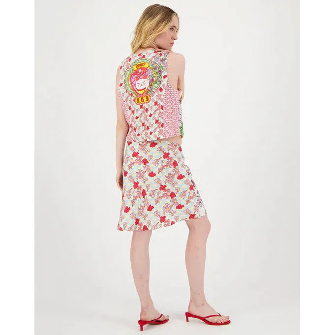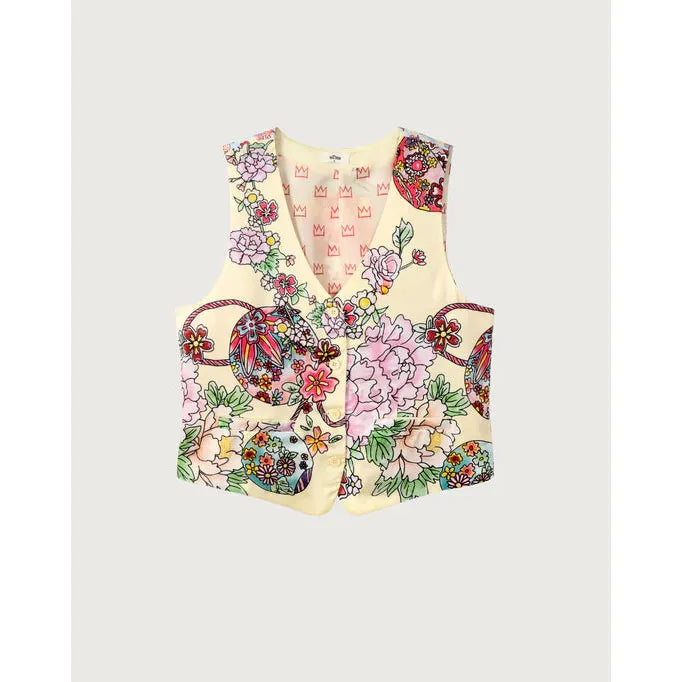 100% Viscose vest in our Lucky Me pattern. Front and back are two different patterns. V-neck, four button closure.