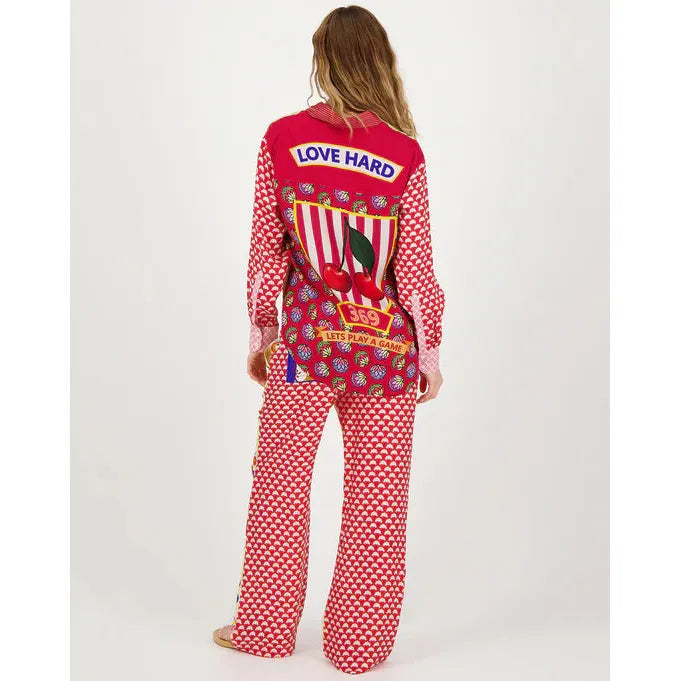 100% Viscose long sleeve shirt in Me369's Lucky Me pattern. Collar, cuffs, sleeves and body of shirt, both front and back, are all represented by different Lucky Me patterns. Shirt reads “LOVE HARD,” “369” and “LET’S PLAY A GAME” across back