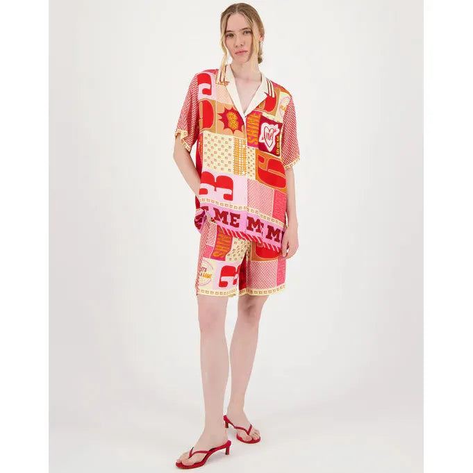 100% Viscose short sleeve knit collar shirt in Me369's Lucky Me pattern. Button down. Body of shirt and sleeves are in different Lucky Me patterns. Shirt reads “ME” along the hemline.