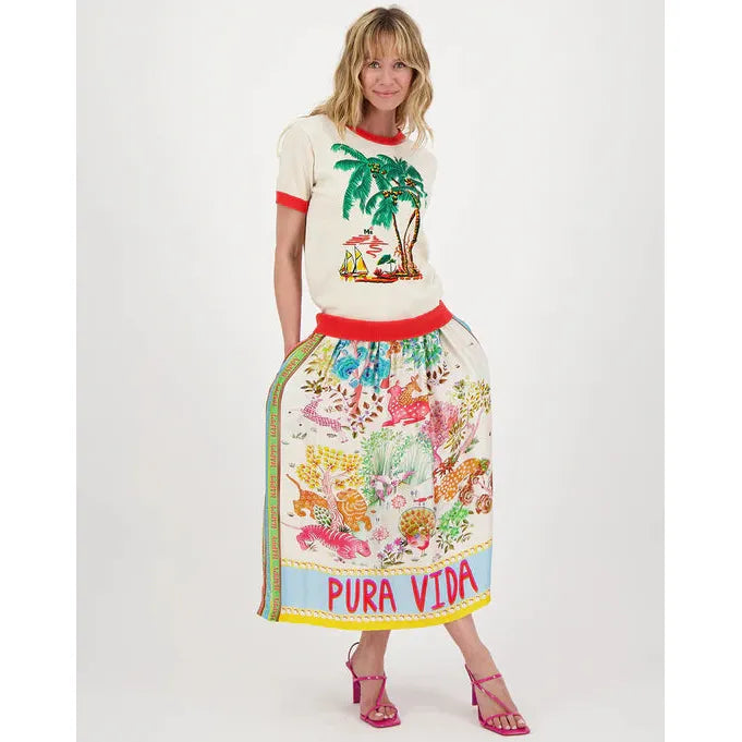 Short sleeve pullover shirt. Shirt features pretty palm trees and boats. All edges are in red.
