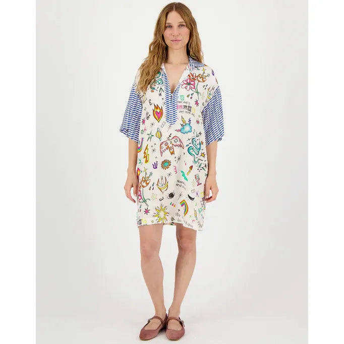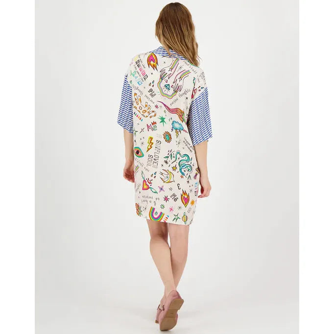 Mini dress with placket in Me369's Enlightenment print. Dress is straight, sleeves are elbow length. Front, back and sleeves of dress are different Enlightenment prints. Perfect for a colorful, cosmic look