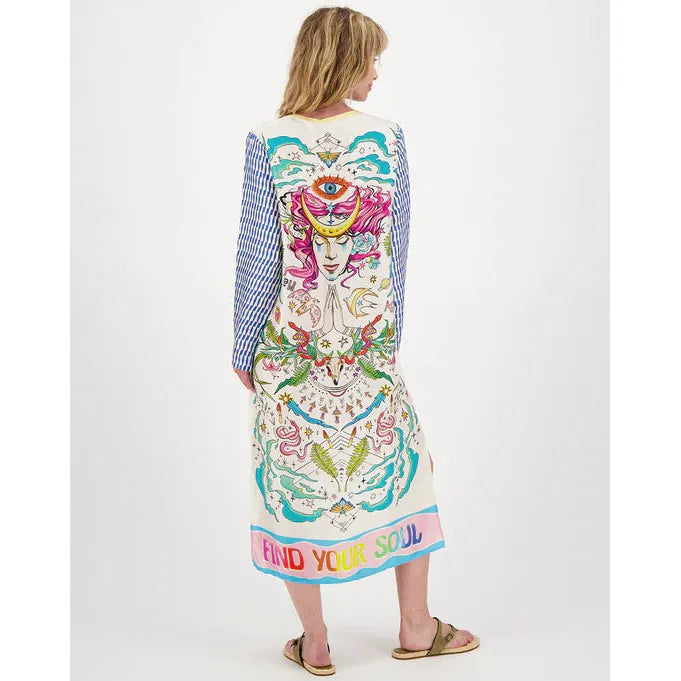 Midi length, long sleeve Enlightenment dress. Soft V-neck. Super cute celebration of color and creativity
