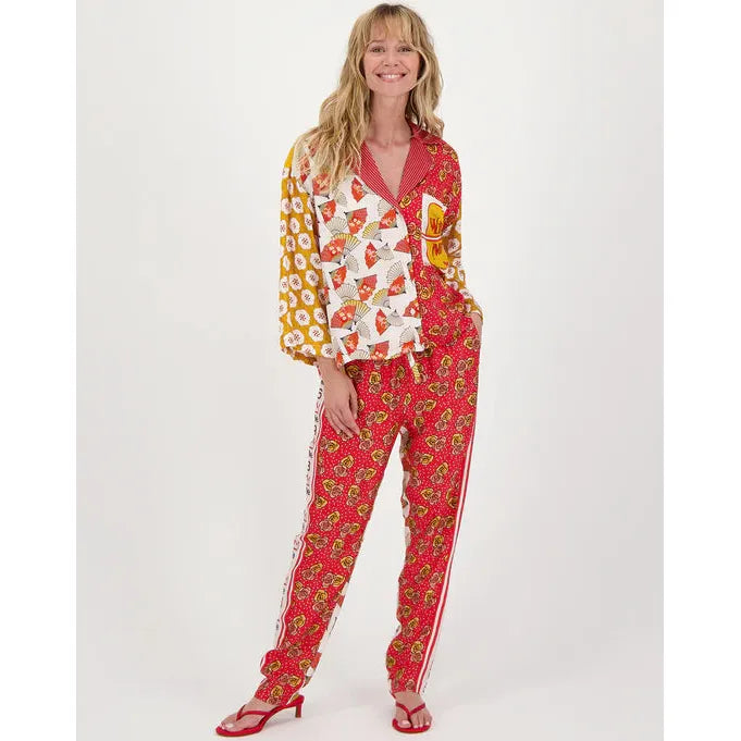 100% Viscose, button down long sleeve shirt in Me369's Lucky Me pattern. Sleeves are a bit wide without cuffs. Front is shorter than back. Asian inspired print on front. Back reads “LUCKY” on top and has the word “ME” all over. Pair with our matching pants for an arty, retro look