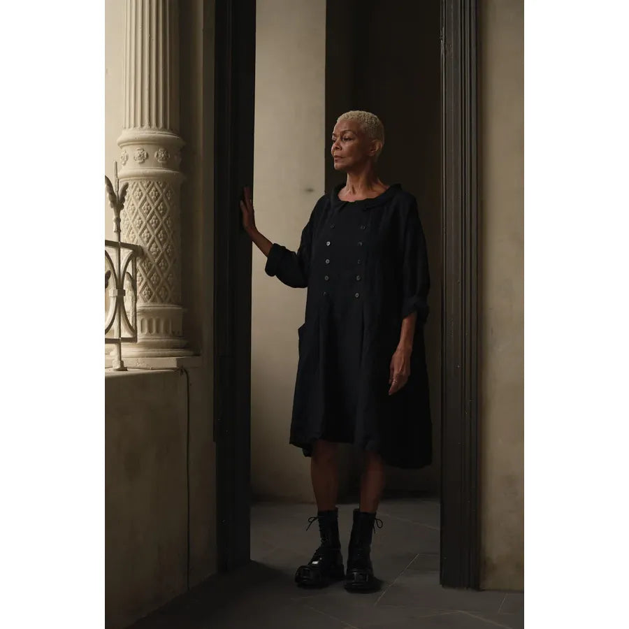 Crafted from medium-weight linen, our Maud Tunic moves with ease. Its subtle A-line silhouette is framed by a soft collar, with black shell button detailing across the front bodice. A buckle at the back allows the shape to be gently adjusted, offering balance between form and freedom.