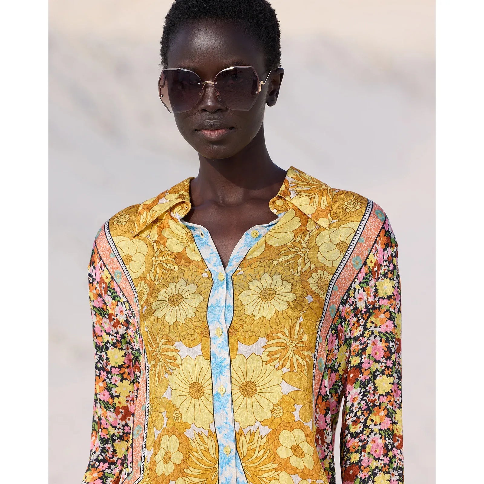 Elegant and light, this straight-cut shirt in jacquard viscose features a vibrant sunflower yellow floral print, enhanced by delicate blue lines placed on the edges.