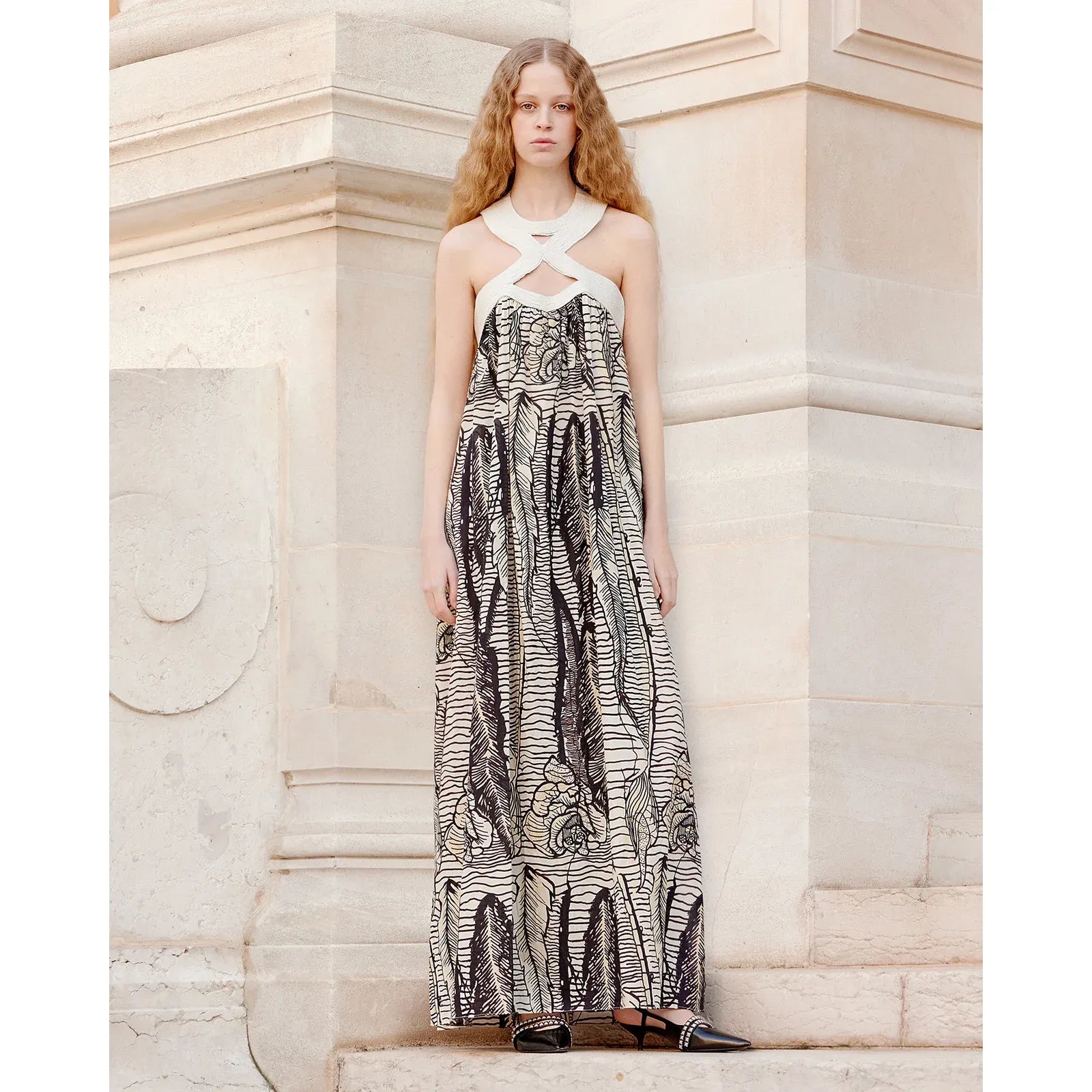 Ivory ribbed fabric bands delicately frame the neckline, while at the back, a single fabric strap serves as a shoulder strap, creating a graphic and contemporary effect. High side slits add a bold dimension and allow for freedom of movement, while bringing a touch of sophistication to the entire look.