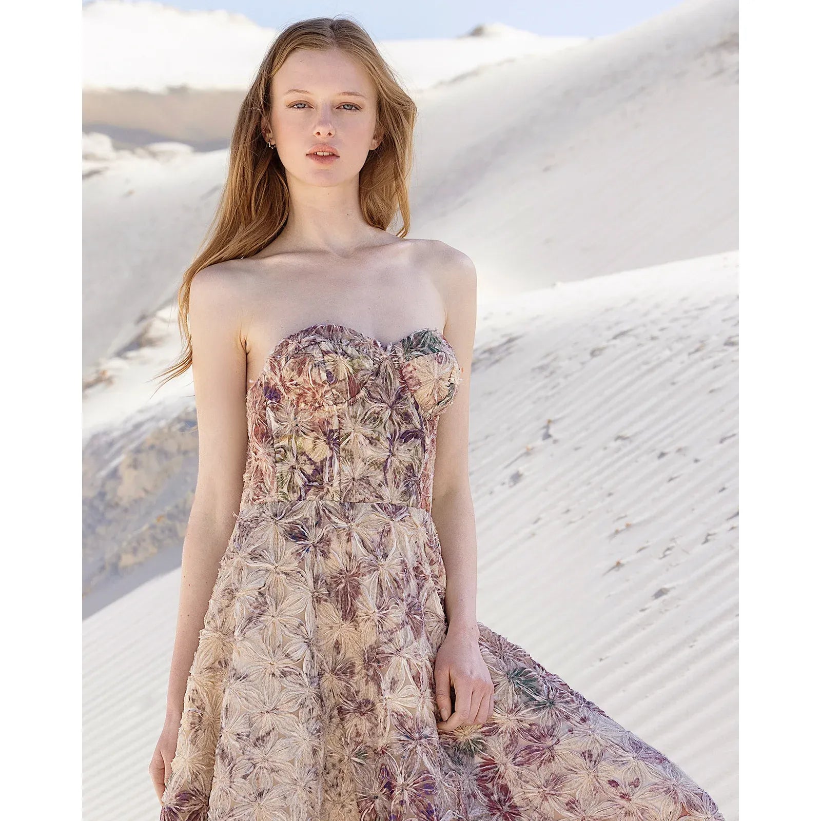 Adorned with overlaid floral patterns, adds a refined texture and a sophisticated visual effect. The zipper at the back ensures a perfect fit, while the cup shape at the bust provides subtle support and a structured look. An ideal piece for special occasions, combining romance with modernity.