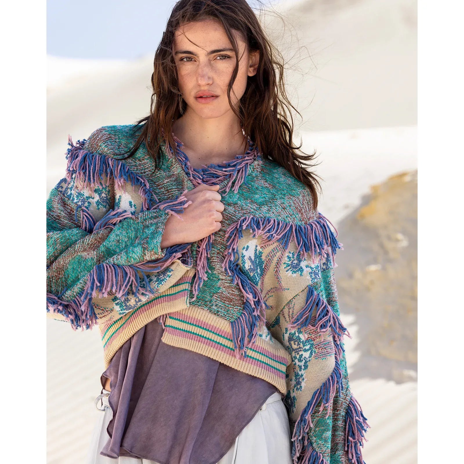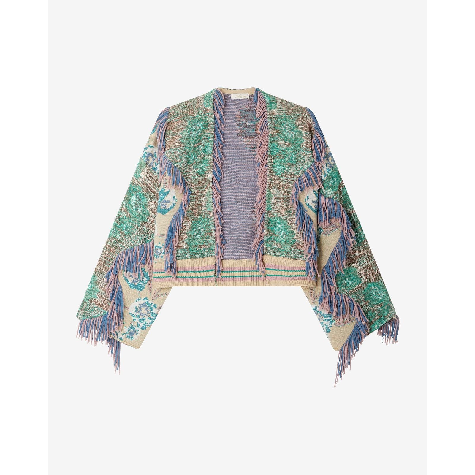 Short jacquard knit cardigan, inspired by the weaving of an antique tapestry, enhanced with delicate fringes for a bohemian and refined touch. Its fluid, open-front design gives it a natural elegance, while its wide sleeves add volume and movement.