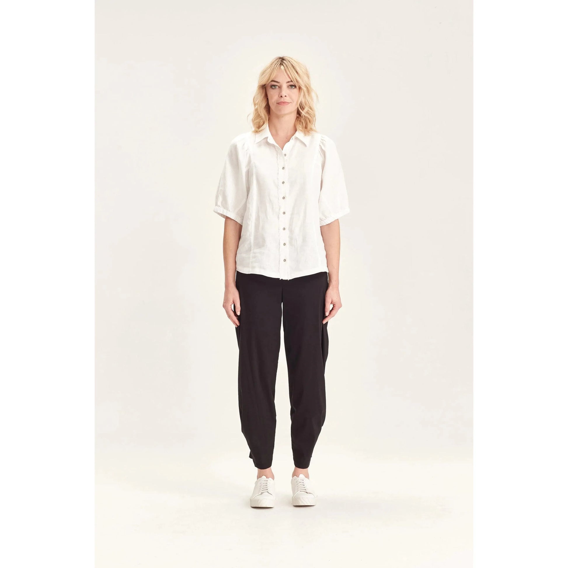 Verge's Acrobat Kalia pants with a contemporary Tulip-shaped leg profile. The Kalia pant has a narrow elasticated waist with a relaxed leg that features tucks at the back of the hemline to create fullness and interest. Made in our exclusive European lightweight stretch cotton Acrobat fabric for comfort, breathability, and easy care.